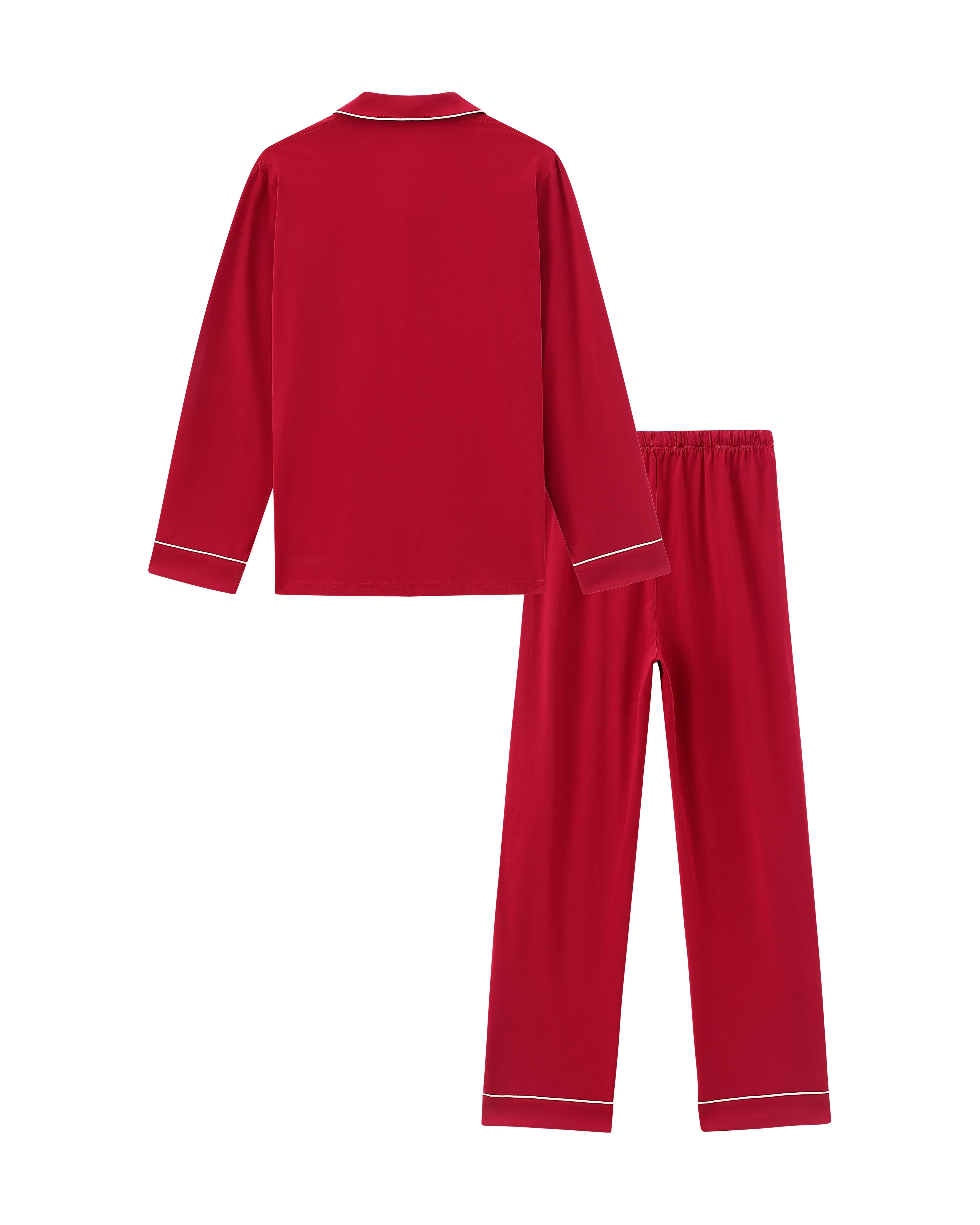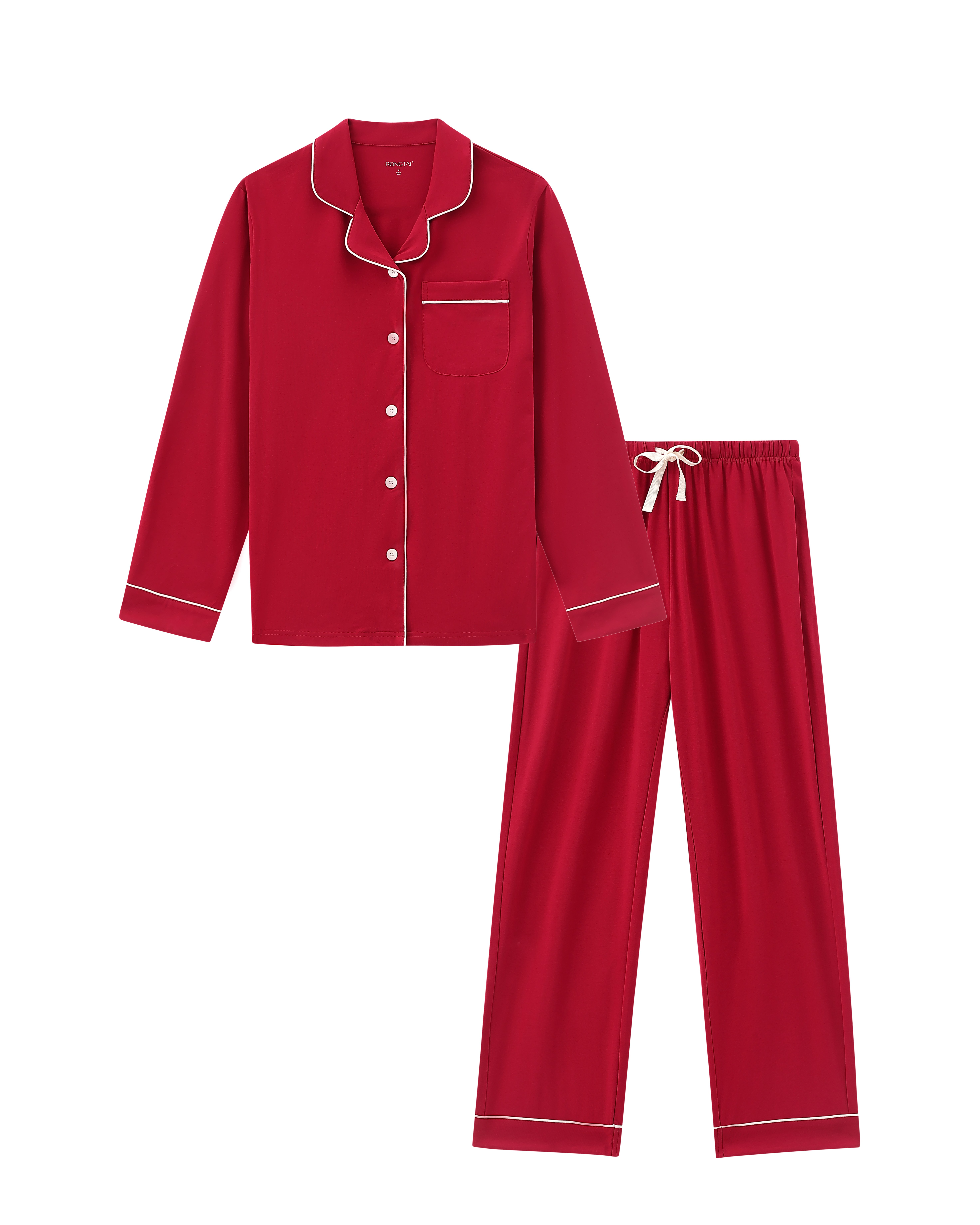 Divdaļīgs pidžamu komplekts: Poga priekšā, garas piedurknes un apkaklītes dizains, krekls ar praktisku krūšu kabatu, elastīga josta ar aukliņu, kas pielāgojas viduklim, kā arī rūpīgi izstrādātas kabatas abās pidžambikšu pusēs. Kopumā – mīksts un viegls komplekts, ideāli piemērots gan mājām, gan naktsmieram.